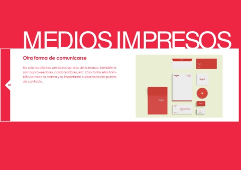 MEDIOS IMPRESOS Otra forma de comunicarse No solo los clientes son los receptores de la marca, también lo son los proveedores, colaboradores, etc. Con todos ellos tam- bién se hace la marca y es importante cuidar todos los puntos de contacto. 03 04